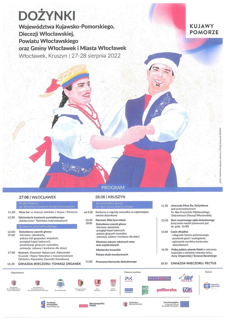 w tym roku świętujemy we Włocławku i Kruszynie – Włocławskie bulwary i lotnisko w podwłocławskim Kruszynie będą miejscem tegorocznych dwudniowych obchodów wojewódzkiego święta plonów, które w ostatni weekend sierpnia organizujemy wspólnie z kurią diecezjalną we Włocławku, powiatem włocławskim oraz Gminą Włocławek i Miastem Włocławek. W programie poza barwnym korowodem dożynkowym m.in. jarmark produktów regionalnych i ekologicznych, swojskie rytmy etno w wykonaniu formacji pieśni i tańca, wystawa maszyn rolniczych oraz piknik eko z udziałem Tomasza Organka i jego zespołu. Obchody święta plonów rozpoczną w sobotę 27 sierpnia przedpołudniowa uroczysta msza święta w intencji rolników Pomorza i Kujaw w należącym do franciszkanów kościele Wszystkich Świętych na placu Wolności oraz ceremonia odsłonięcia kamienia pamiątkowego poświęconego działaczom Solidarności Rolników Indywidualnych. Wydarzenia na Bulwarach Józefa Piłsudskiego rozpoczną się w samo południe. Po kiermaszu rękodzieła, pokazach kół gospodyń wiejskich, przeglądzie kapel ludowych i dedykowanym dzieciom bloku zabaw, późnym popołudniem koncert z udziałem Orkiestry Kijowskiej Operetki Narodowej oraz utalentowanych młodych śpiewaków operowych. Gwiazdą wieczoru będzie Tomasz Organek. Główne uroczystości, z oficjalnymi wystąpieniami i mszą celebrowaną przez bpa Krzysztofa Wętkowskiego – a także m.in. kiermasz dożynkowy, ludowe rytmy w wykonaniu lokalnych kapel, wystawa maszyn rolniczych, „husarska” inscenizacja historyczna i prezentacje współczesnych militariów – w niedzielę 28 sierpnia na lotnisku aeroklubu w podwłocławskim Kruszynie. W programie także próba bicia rekordu Polski w tańczeniu kujawiaka i 35-kilometrowy dożynkowy rajd rowerowy, ze startem i metą na płycie lotniska, w którym zakładamy udział 250 amatorów dwóch kółek (zapisy na kujawsko-pomorskienarowery.pl). Wieczorem na scenie wystąpi zespół Pectus. Tradycyjnie podczas dożynek rozstrzygniemy konkursy na najpiękniejsze wieńce i najlepsze stoiska promocyjne.
