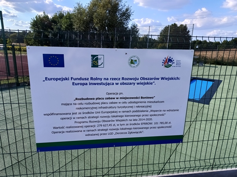 Projekt dofinansowany z Programu Rozwoju Obszarów Wiejskich na lata 2014-2020 na operacje, które odpowiadają warunkom przyznania pomocy w zakresie rozwoju ogólnodostępnej i niekomercyjnej infrastruktury turystycznej lub rekreacyjnej lub kulturalnej działanie 19„Wsparcie dla rozwoju lokalnego w ramach inicjatywy LEADER”/ poddziałanie 19.2 w zakresie Przebudowa placu zabaw w miejscowości Boniewo