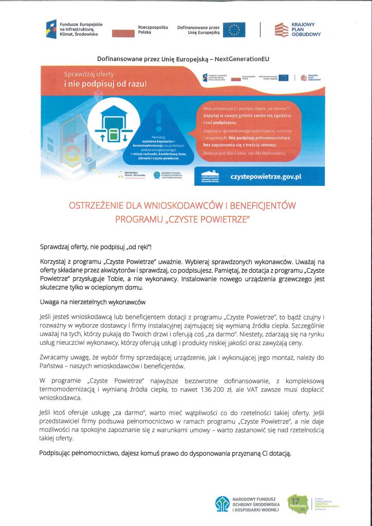 Ostrzeżenie dla wnioskodawców i beneficjentów programu “Czyste Powietrze”