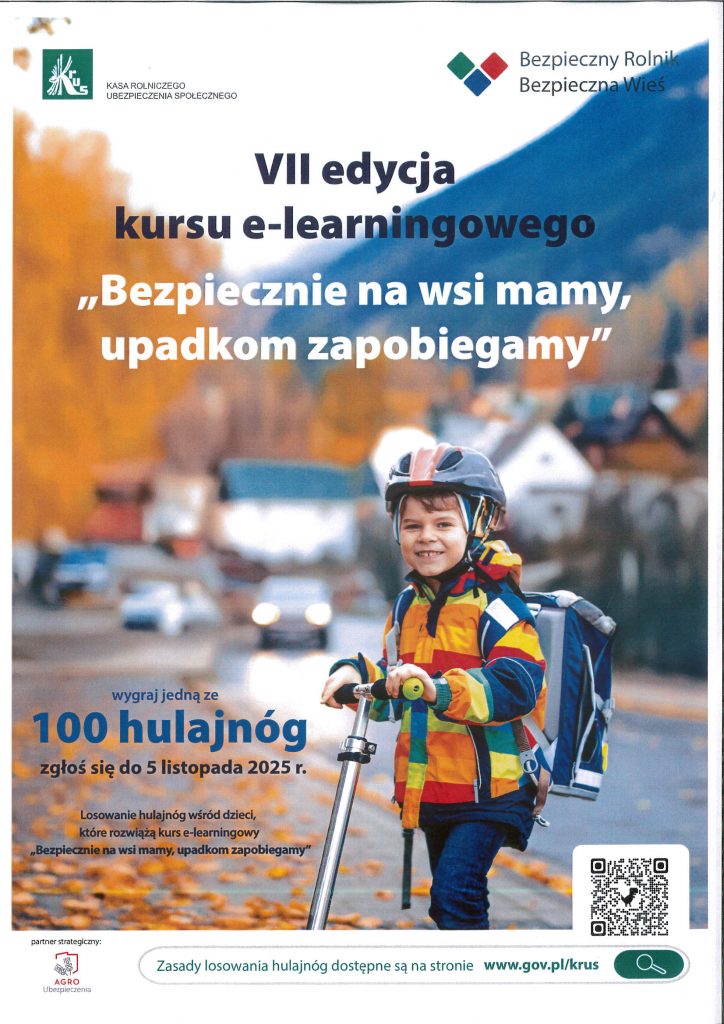 Kasa Rolniczego Ubezpieczenia Społecznego już po raz siódmy zaprasza dzieci rolników do udziału w kursie e- learningowym pt. „Bezpiecznie na wsi mamy – upadkom zapobiegamy”, który w nowoczesnej formie przybliża zagrożenia wypadkowe w gospodarstwach rolnych, a także uczy prawidłowych zachowań podczas przebywania na terenie obejścia.