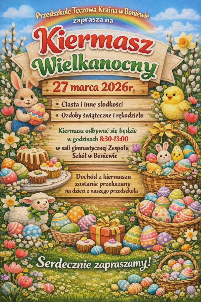 Aktualności Kiermasz Wielkanocny 2026 2026-03-12 08:05 / Serdecznie zapraszamy na kiermasz, którego organizatorem jest Przedszkole Tęczowa Kraina w Boniewie.