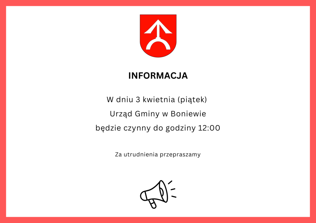 Aktualności Informacja – 3 kwietnia (piątek) 2026-04-02 15:19 / W dniu 3 kwietnia (piątek) Urząd Gminy w Boniewie będzie czynny do godziny 12:00