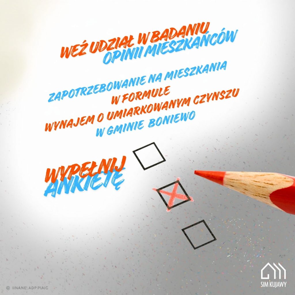 Społeczna Inicjatywa Mieszkaniowa SIM KZN Kujawy we współpracy z Gminą Boniewo, prowadzi badanie mające na celu rozpoznanie zapotrzebowania na mieszkania na wynajem o umiarkowanym czynszu. Badanie to pozwoli na określenie realnych potrzeb mieszkańców oraz ocenę zasadności planowanej inwestycji mieszkaniowej na terenie naszej gminy.